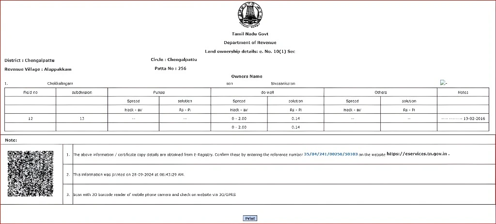 | Key Information | Owner’s name, Patta number, Survey & subdivision numbers, Land area, Land type, District/Taluk/Village, Tax details |